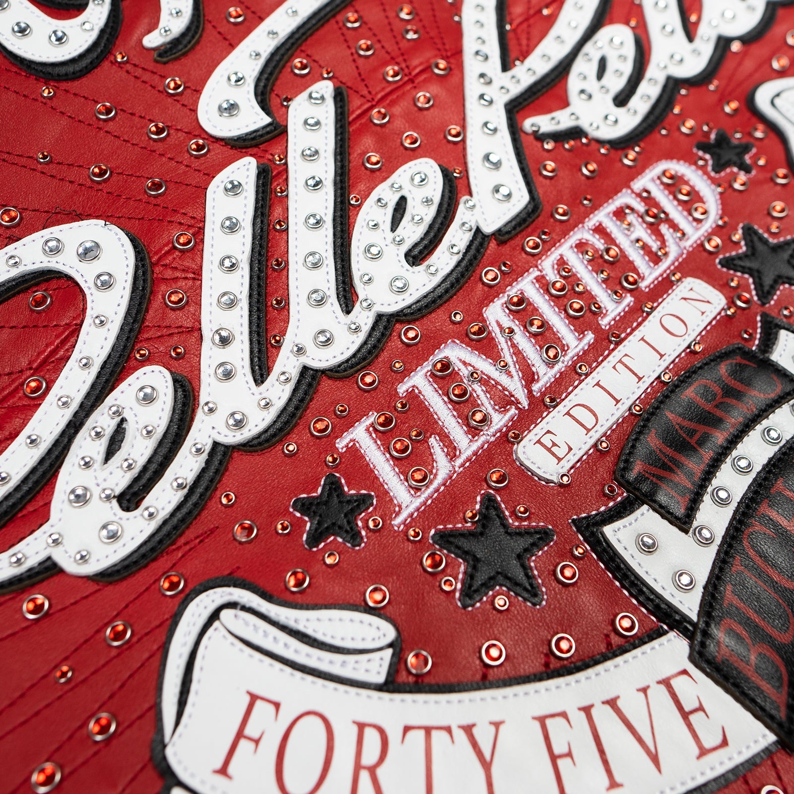 - MULTI LAYERED AND OVERSIZED "GREATEST OF ALL TIME - PELLE PELLE" LEATHER APPLIQUE ARTWORK WITH DIRECT EMBROIDERY AND APPLIED RHINESTONES