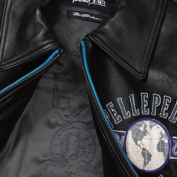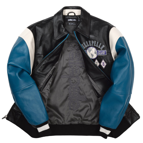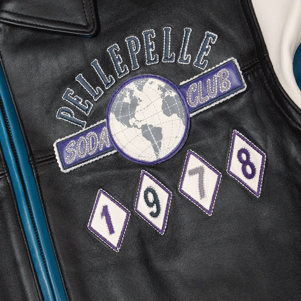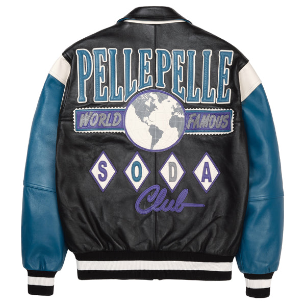 - MULTI LAYERED "PELLE PELLE WORLD FAMOUS SODA CLUB" LEATHER APPLIQUE ON THE BACK OF THE JACKET